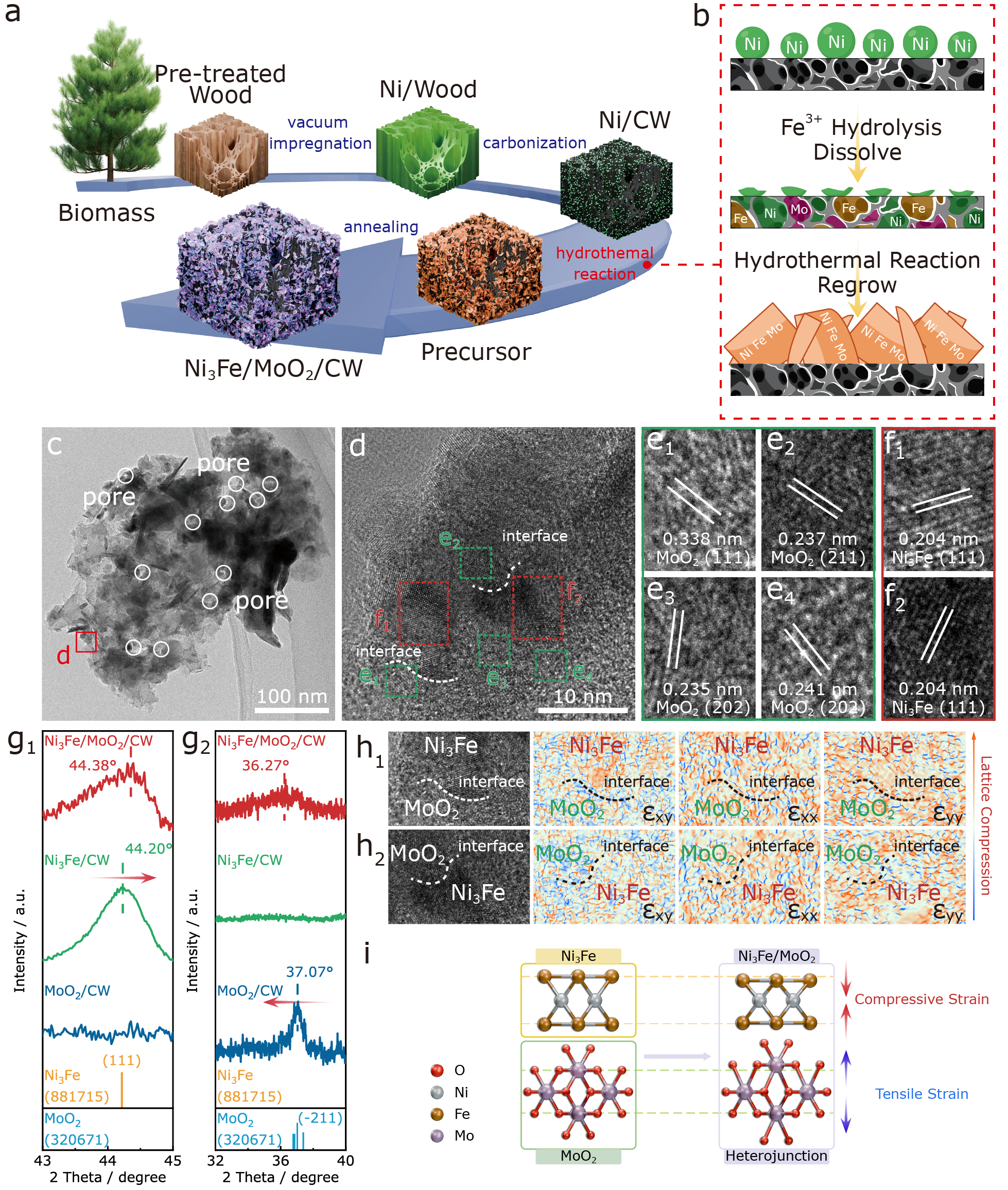电解水制氢被认为是实现绿色能源转型的重要途径之一,但在工业高电流密度下,非贵金属催化剂常面临析氢和析氧反应缓慢、气液传质受限等难题。针对该难题,课题组利用木质纤维的优势构筑了负载于三维碳化木材上的Ni3Fe/MoO2异质结催化剂,通过引入MoO2诱导Ni-Fe键长收缩并实现界面电子转移,从而优化催化剂的电子结构和反应中间体吸附行为,大幅提升反应动力学,实现了优异的活性和耐久性。实验表明,该催化剂在碱性条件下仅需45 mV和251 mV过电位即可分别驱动10 mA cm-2析氢和300 mA cm-2析氧电流密度;在阴离子交换膜电解槽中,能够在2.069 V下稳定维持1000 mA cm-2电流密度超过24小时,展现出优异的工业应用潜力,同时为开发高效木质纤维碳基电催化剂、推动绿色氢能产业化提供了新思路。