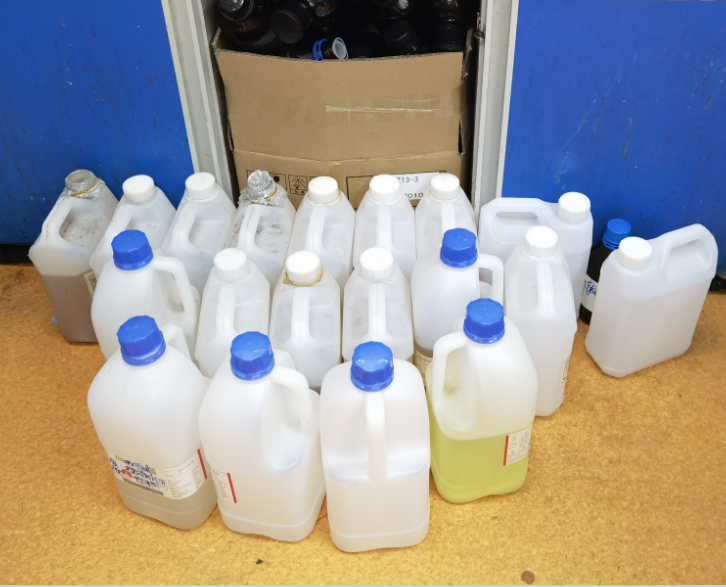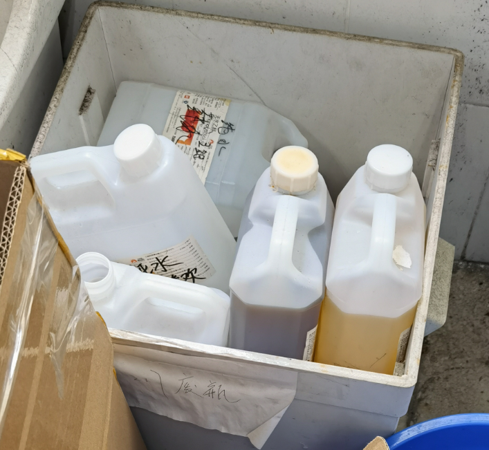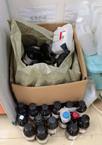 (1)塑料、玻璃空瓶未分类,与废液混放。存在此类问题的实验室有:214、216、217、218、219、420、509、511、609。