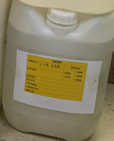 (2)未建立废液回收记录的实验室有:208、210、212、214、216、218、219、220、318、420、421、511、516、607、611、无机楼116、无机楼303。几乎所有实验室都未设置废液存放区,未张贴废液相容表。