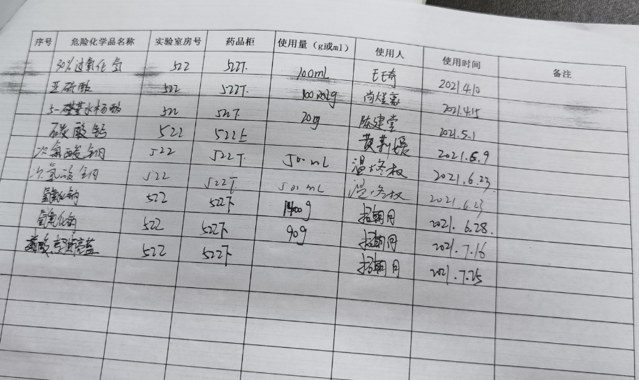 无危化品使用记录的实验室:208、212、218、219、318、无机楼116、无机楼303。危化品使用记录不全的实验室(无使用量、近期未记录的):210、217、418、419、423、518、522。所有实验室都未能做到危化品台账的动态更新。