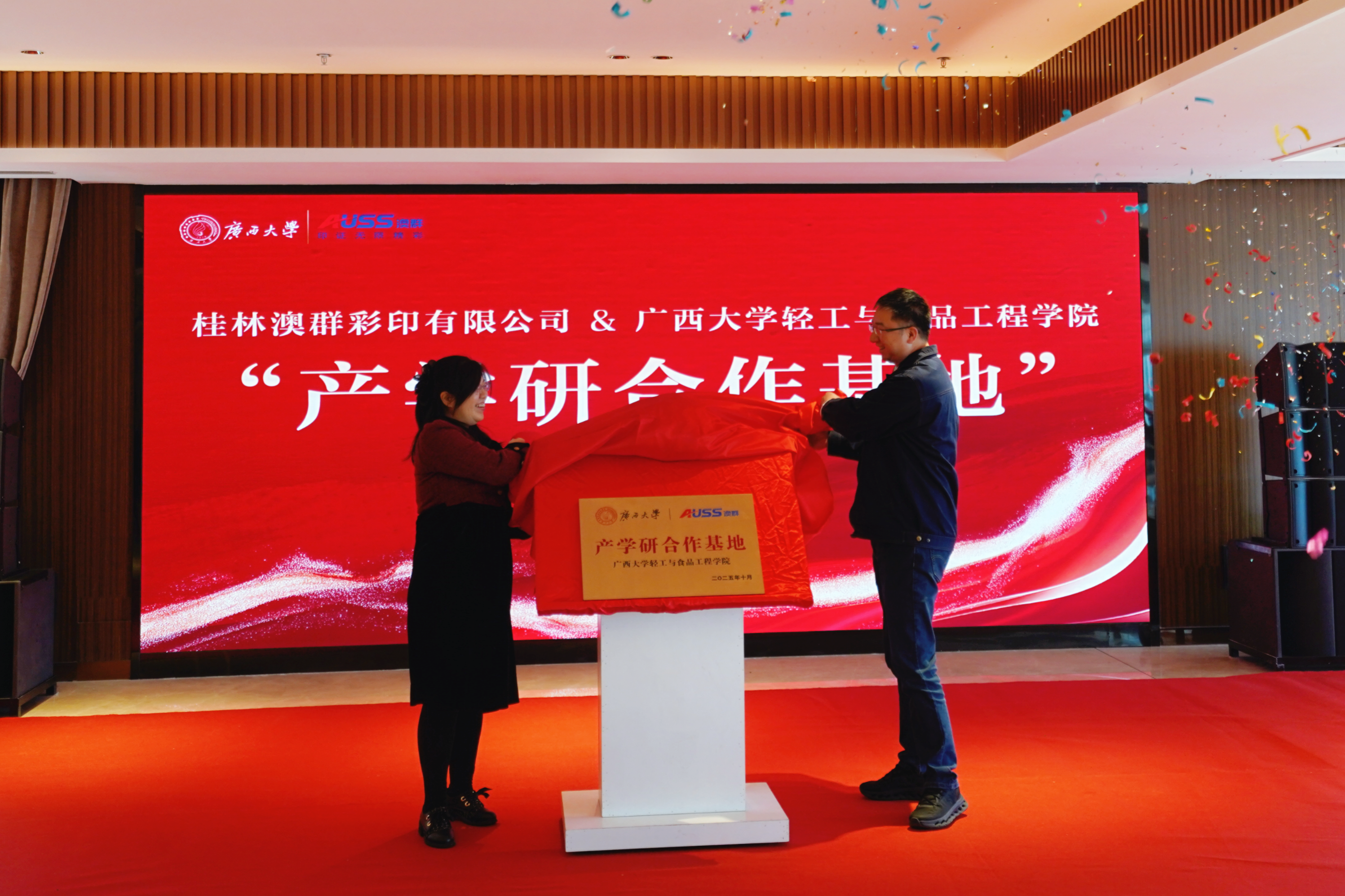 桂林澳群彩印有限公司总经理覃峰、经营副总经理王浩等公司领导与员工,以及轻工学院领导与教师共同出席耽美漫画 与桂林澳群彩印有限公司产学研合作基地挂牌仪式。仪式上,桂林澳群彩印有限公司总经理覃峰与轻工学院副院长陆登俊分别致辞,并共同为双方产学研合作基地揭牌。