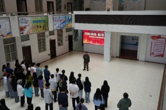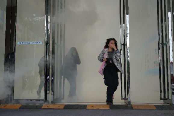 大楼开展,随着应急广播警报响起,老师同学们在工作人员的指引下,按照逃生技巧要求通过指定逃生路线迅速撤离学院楼,到达安全区域。