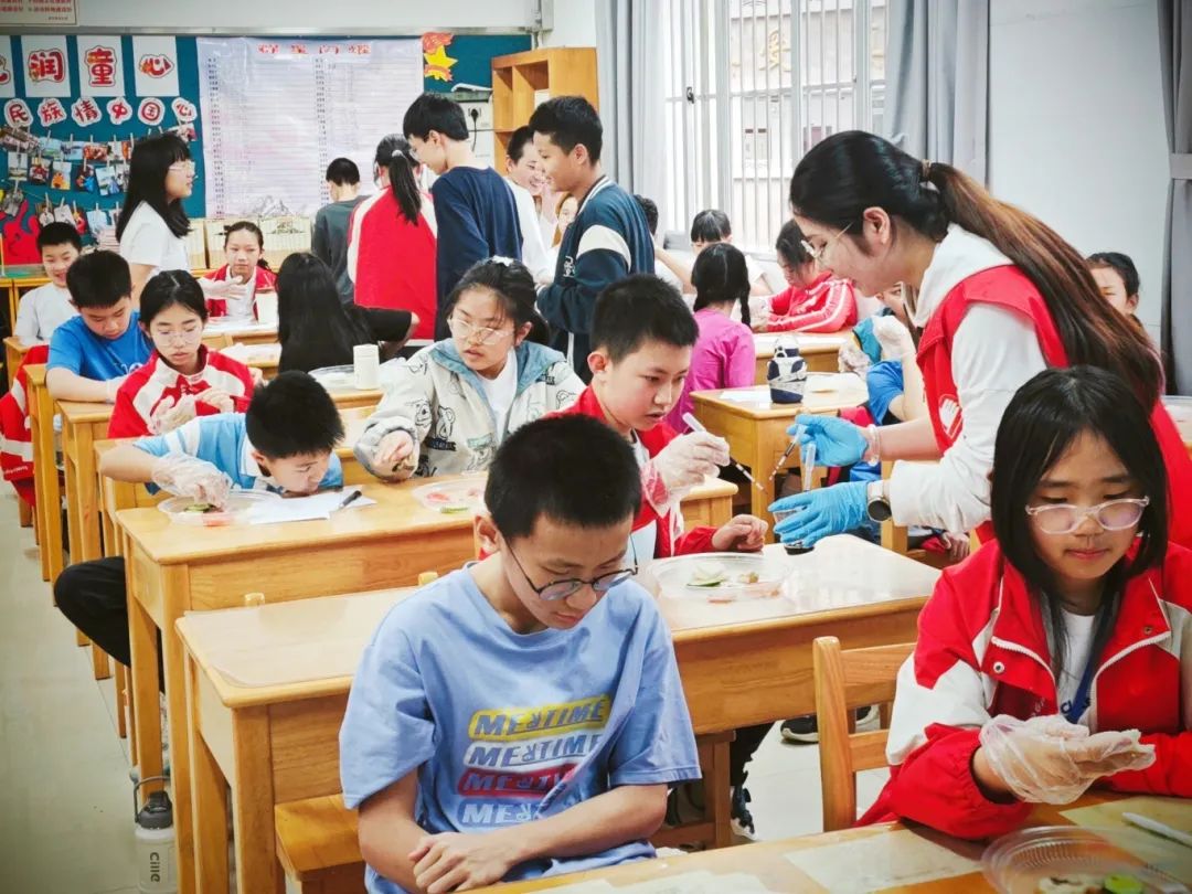 在宣讲中,主讲人巧妙运用知识迁移与情境创设的方法,借助哪吒以莲藕重塑肉身的神话情节,自然流畅地引入对莲藕营养成分的科学实验。在宣讲团讲师卢苇、胡莉的指导下,同学们开展了两项有趣的实验,帮助同学们了解日常食物中的营养成分——淀粉和蛋白质。通过碘液对淀粉的显色反应,探究馒头、西红柿、莲藕以及瘦肉等常见食材中是否含有淀粉。通过观察使用双缩脲试剂对蛋白质的显色反应,直观了解牛奶中蛋白质的特性。这些实践探究活动,充分体现了 “做中讲、讲中思” 的理念,不仅加深了同学们对食物营养结构的科学认知,更极大激发了他们对科学实践的浓厚兴趣,为培养创新思维与实践能力奠定坚实基础。