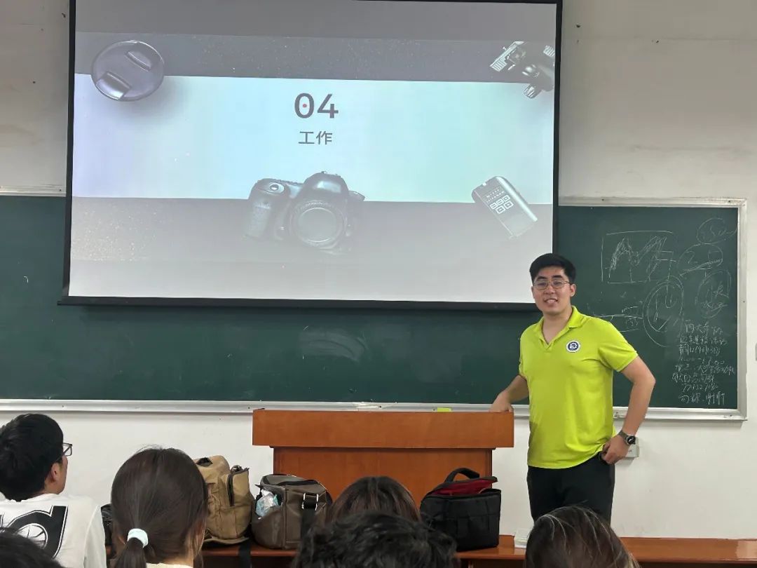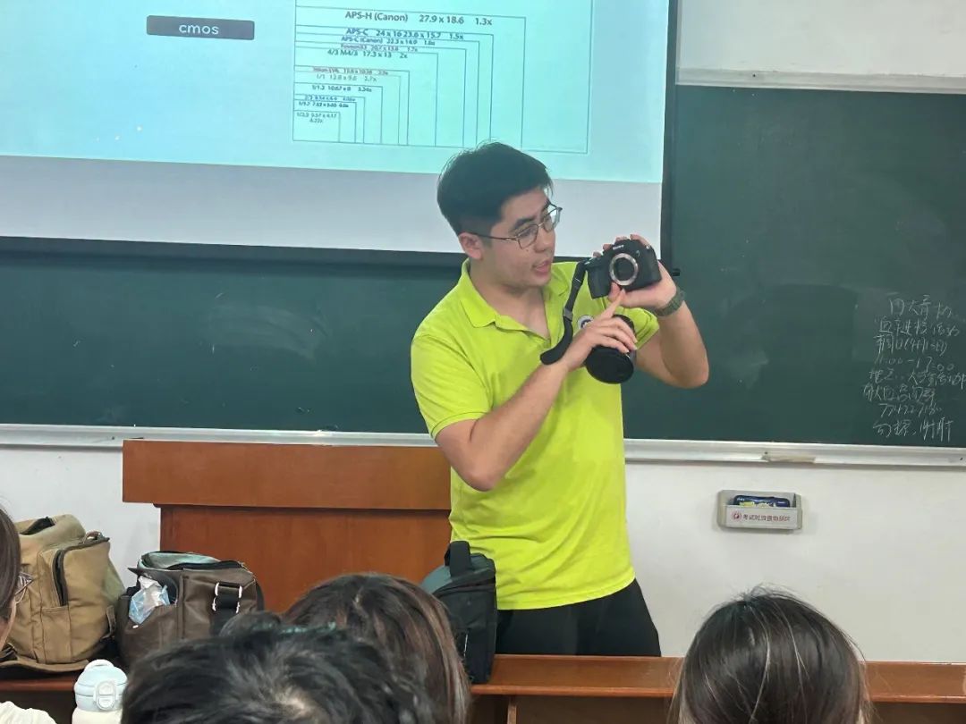 培训会上,覃思源系统讲解了数码相机的工作原理,深入解读了光圈、快门速度、ISO感光度等核心参数的联动关系。他还结合不同焦段镜头的成像特点和校园新闻场景实例,重点介绍了会议摄影的黄金机位选取、活动跟拍的动态捕捉要诀以及科研场景的静物布光技巧。