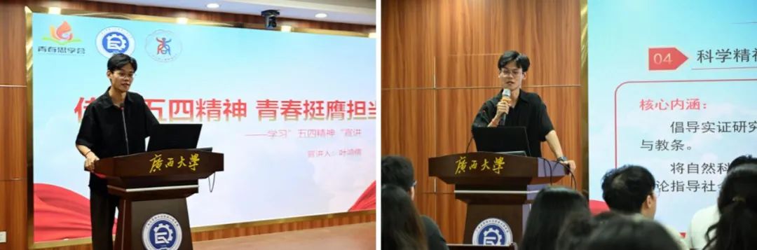 研究生会主席团成员叶鸿儒作主题宣讲。他分享了五四精神的历史背景与核心内涵,并结合“两个一百年”奋斗目标的历史方位,指出青年群体肩负着双重使命:既要做五四精神的传承者,将五四精神内化为精神品格;更要做创新发展的践行者,在学术研究与社会实践中积极践行五四精神。叶鸿儒表示,五四精神不仅是历史遗产,更是与时代紧密相连的精神力量——当我们将实验室的灯光与民族复兴的曙光相连,将文献检索的关键词设为国家需求时,五四精神便与我们的科研工作紧密相连,成为新时代科研攻关中的强大精神动力。
