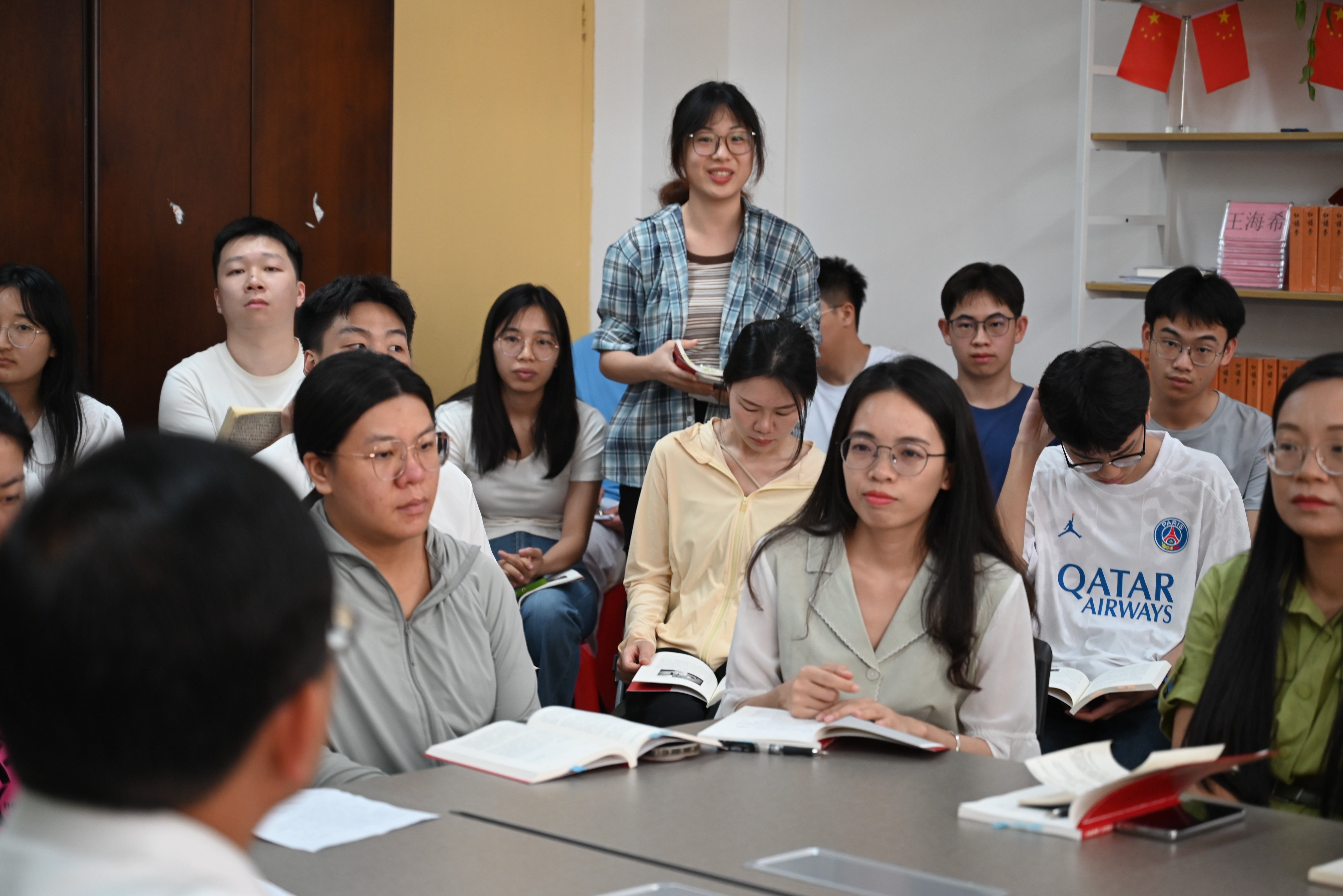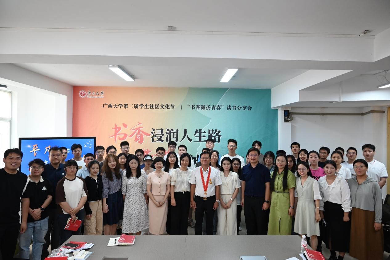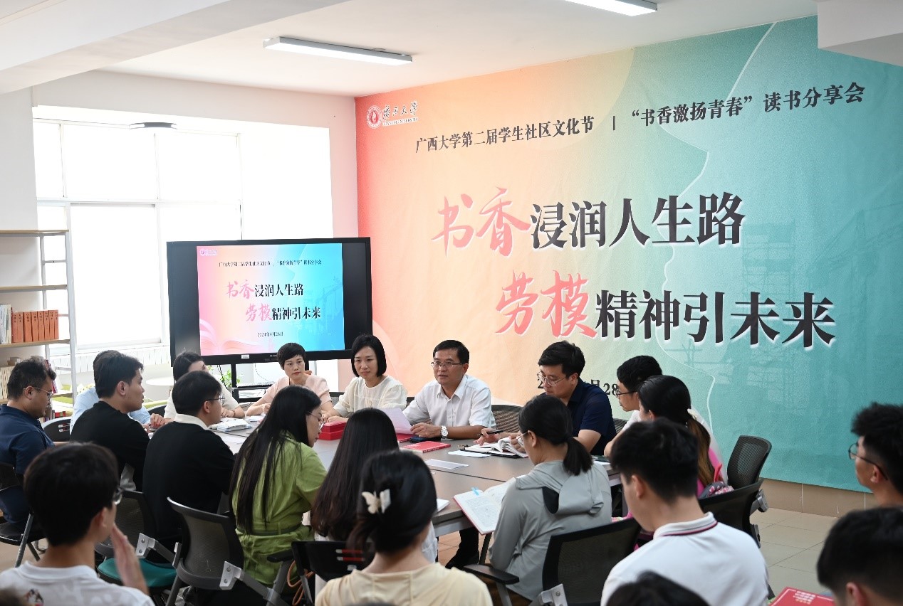 分享结束后,覃程荣教授和学生们齐读《劳模精神、劳动精神、工匠精神学习读本》,一同感悟劳动精神的力量,领略劳动的光荣。
